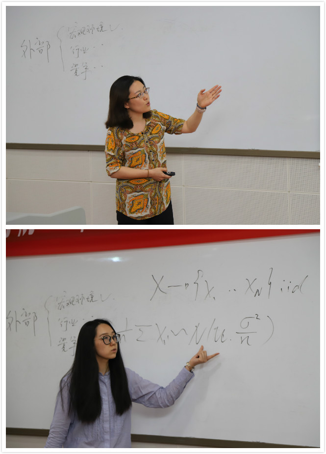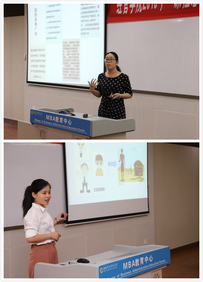 随后七名参赛选手陆续登场,分别从任教的课程内容出发,将“思政元素引入课堂”,突出以社会主义核心价值观为引领,以理想信念教育为核心。营销教研室教师王谊讲授“产品经理”这一知识点,以“如何移动富士山”这一问题入手,授课注重将理想教育(职业理想和社会理想)和爱国主义教育(将民族自豪感与危机感)相结合。讲解内容由浅入深,通俗易懂,润物无声式地将家国情怀及理想教育渗透其中;农经教研室教师马红玉以“农业经济学”中人力资本方面的知识作为授课内容,将深奥的专业知识贯穿在励志短片中,引导并培养学生在乡村振兴背景下投身农村、服务三农的情怀,引起阵阵掌声;工商教研室新进教师邱璐通过对企业宏观环境案例分析,激发学生对现代企业发展的关注,让学生意识到团队合作与交流在科学研究中的重要性,能够主动地获取除专业知识外的新知识和新能力,提高自身思想文化素质。各位参赛选手在比赛中或互动热烈、或神采飞扬、或诙谐幽默,各具特色,一堂堂课程精彩纷呈,获得了评委和学生的一致好评。