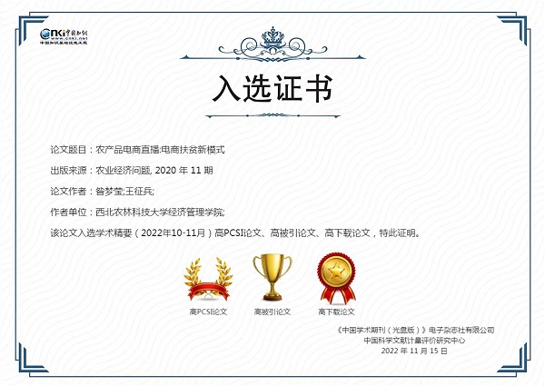 该论文由beat365官网2016级博士研究生昝梦莹为第一作者、王征兵教授为通讯作者共同完成,发表在《农业经济问题》2020年第11期,后被《高等学校文科学术文摘》全文转载,并入选中国知网学术精要库高PCSI、高被引、高下载论文。