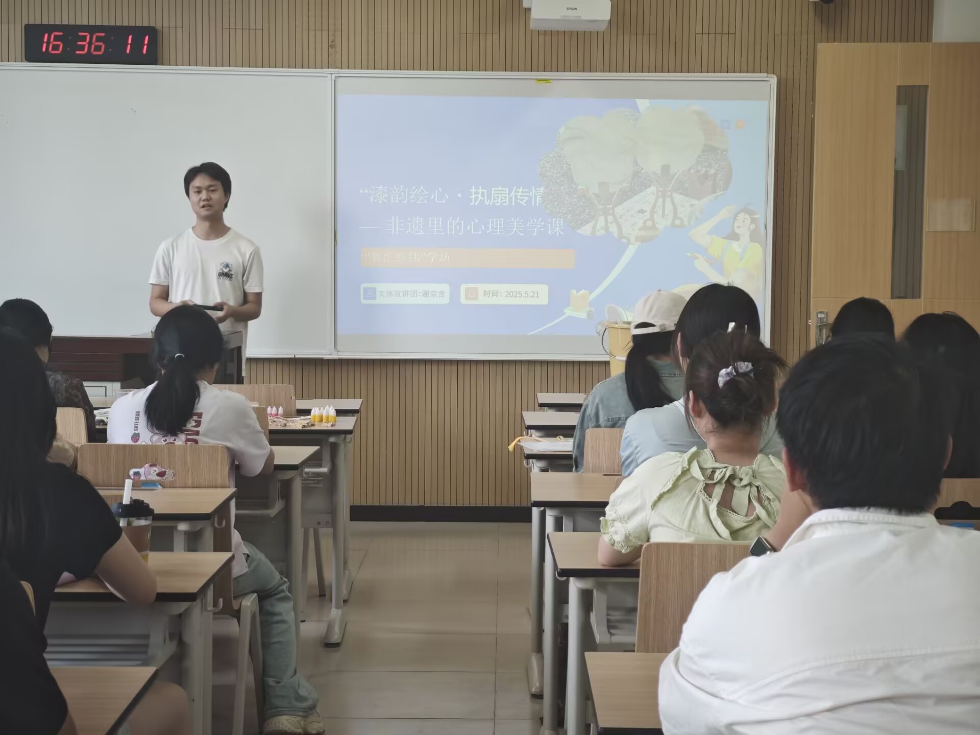 漆香阵阵,扇韵悠悠。5月21日下午,beat365官网心理权益部联合“智汇经纬”文体活动体验坊,在南校一号教学楼成功开展“漆韵绘心·执扇传情”非遗心理美学体验活动,60余名同学在非遗漆扇的魅力中,感受千年技艺的文化底蕴,体验漆墨流彩的心灵疗愈。